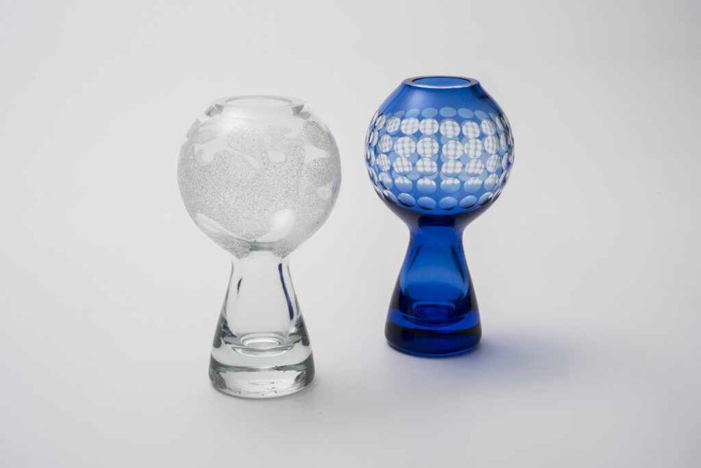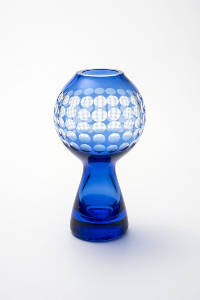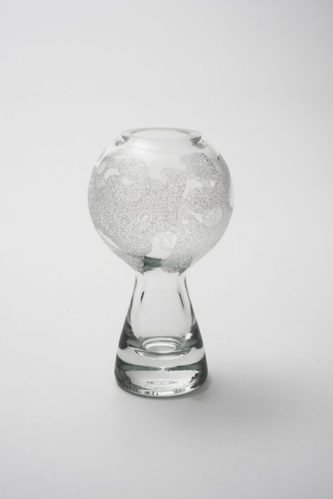 Die dickwandige Glasvase basiert auf zwei geometrischen Formen, der Kugel und dem Kegel. Die Kugel ist oben flach abgeschnitten zu einer kleinen Öffnung und von außen in einem rauhen Handschliff mit einem organisch bewegten Muster dekoriert. Fließend geht die Kugelform in den konisch geformten Sockel aus Vollglas über. Die aus Klarglas gestaltete Vase ist mundgeblasen.