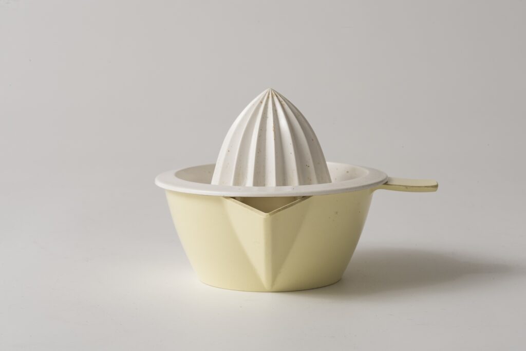 Die Zitronenpresse ist zweiteilig. Der untere Behälter ist aus hellgelbem Kunststoff und konisch geformt, nach unten schmaler werdend. Eine Seite ist als Ausgießer spitz herausgezogen. Im rechten Winkel dazu fließt der Rand in einen flachen, rechteckigen Griff über.